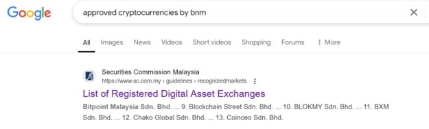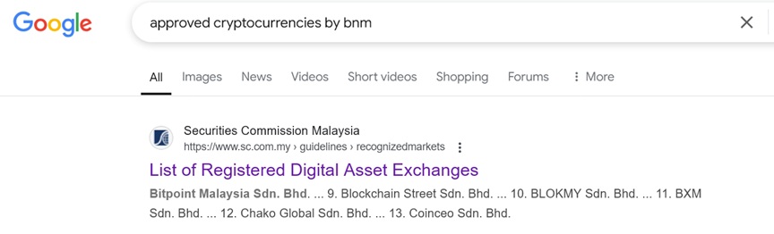 I guess I should also add – you should not be greedy. If you are not greedy for easy money (including FREE stuff from so called contest or lottery) you won’t be scammed! Only invest with a company/institution approved by BNM and/or Secirities Commission Malaysia. If you want to invest in Cryptocurrencies, all you need is google – “Approved Cryptocurrencies By BNM” and you will see below link to Securities Commission Malaysia.