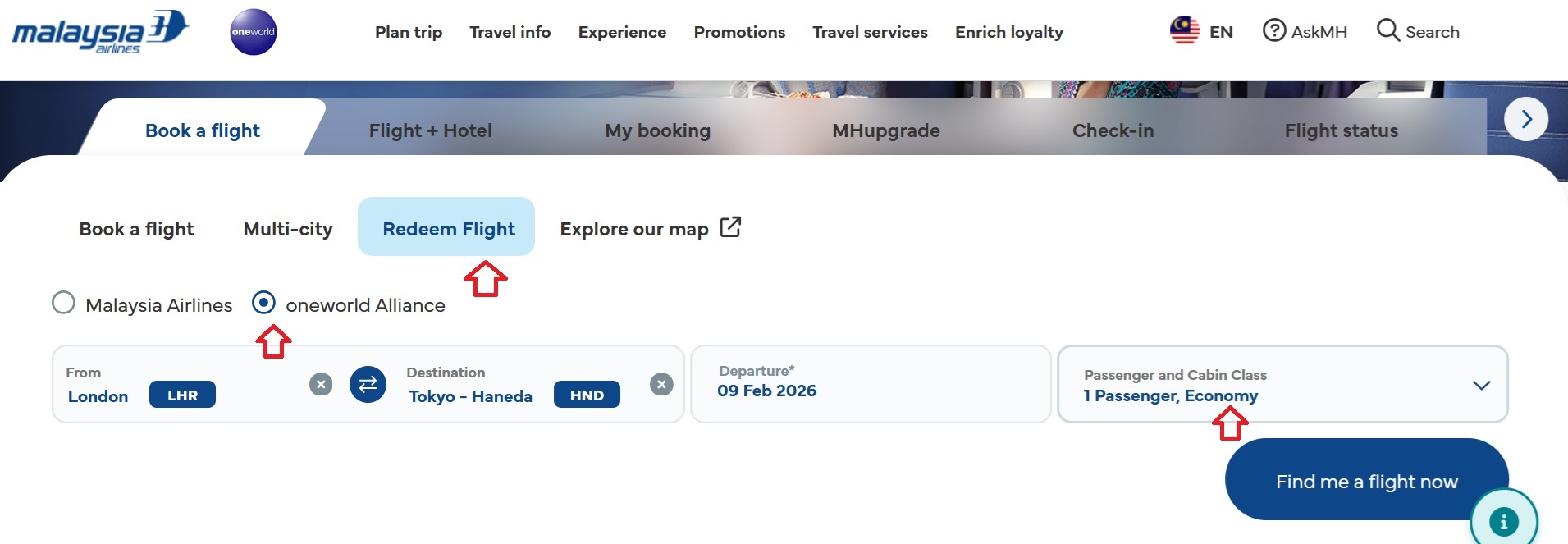 Step 2 – Go to Booking Page (see below) and select Redeem Flight and Then Select OneWorld Alliance. You can maintain class as Economy