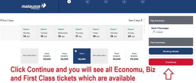 Step 4 – You will then see the Enrich Points required for Economy Class. Click on “Continue” and it will show you all available Economy, Premium Economy, Business Class and First Class which are available for redemption plus the Enrich Points required.