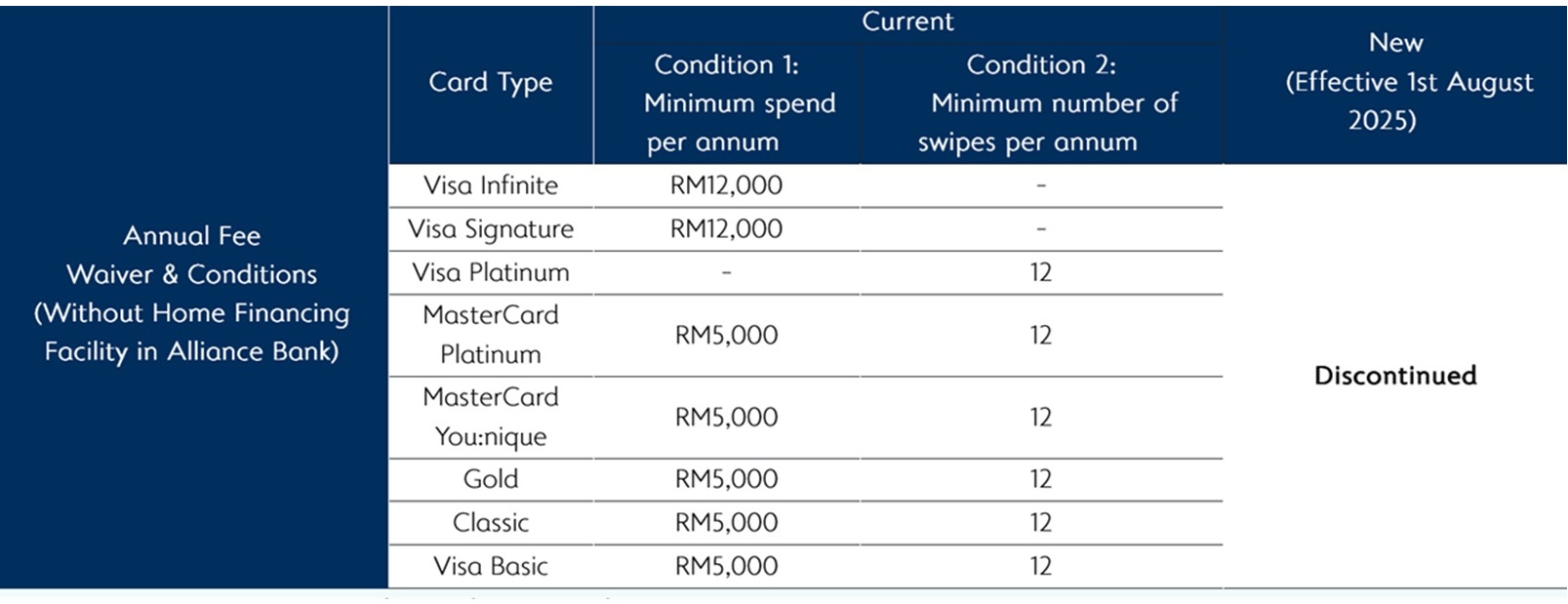 A Sis pointed out to me that Alliance Bank has also revised their annual fee waiver condition effective 1st August 2025. So I went to Alliance Bank Announcement once again and was shocked to note that it is stated DISCONTINUED effective Aug 2025!
