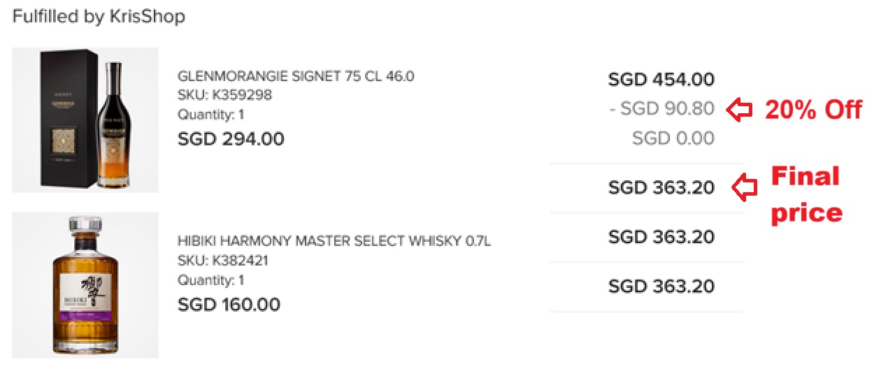 Then on 2nd August 2025, I check out KrisShop again and was shocked (in a good way) that the Glenmorangie Signer and Hibiki Harmony was selling for even cheaper without the 20% discount. As I scrolled down the Wine & Spirits page, the deals were getting more and more and some are really unbelievable.