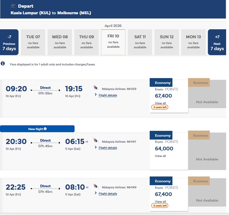 Well, I have managed to redeem Biz Class tickets Melbourne to KL in May 2026 for my wife and I; however, I cannot yet get to redeem any Business Class ticket KUL to MEL in April 2026.