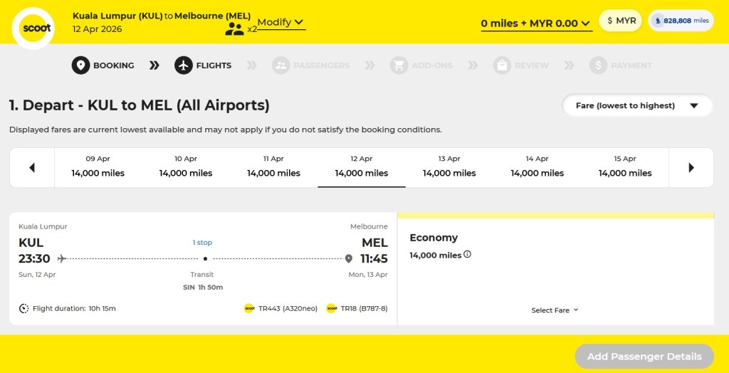 Anyway I am so freaking happy that I can redeem 2 Economy Class tickets with Scoot between 9th to 15th April 2026 KL to Melbourne for only 14K KrisFlyer Miles per pax.