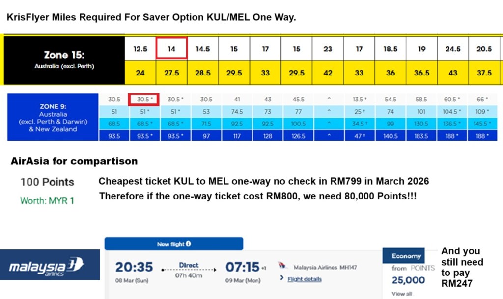 Comparison between Scoot versus Singapore Airlines verus Enrich Points versus AirAsia Points to redeem for an Economy Class ticket Kuala Lumpur to Melbourne.