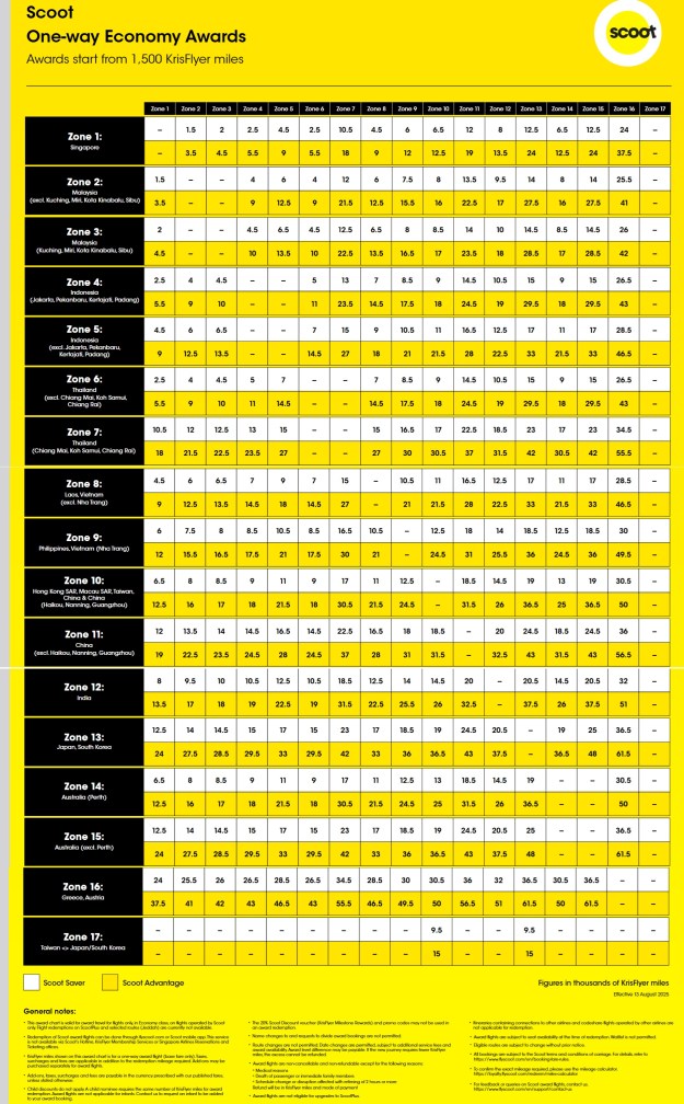 From the above Award Chart, we only need 1500 KrisFlyer Miles with the Saver Option to redeem a Scoot ticket KUL (Zone 2) to SIN (Zone 1) and vice=versa!!!