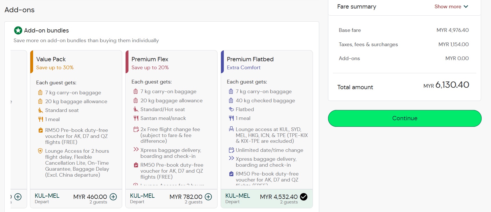 Then when it came to Add Ons- I was once again pleasantly surprised that Premium Flat Bed for 2 pax final total cost is only RM6130.40 or about RM3K per pax!!! Since I cannot redeem any Biz Class Saver Options with Singapore Airlines or Malaysia Airlines, I paid for the AirAsia Premium Flat Bed for my wife and I π