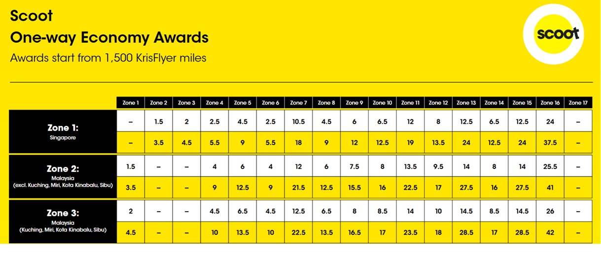 From the above Award Chart, we only need 1500 KrisFlyer Miles with the Saver Option to redeem a Scoot ticket KUL (Zone 2) to SIN (Zone 1) and vice=versa!!!