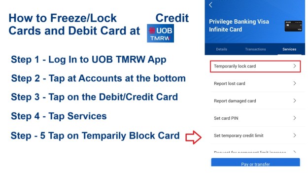 We can block both the UOB Debit Card and Credit Cards at UOB TMRW App. However please note that some transactions at UOB Branch requires the physical Debit Card for verification purposes but it is not an issue if we can unblock the card with our smartphones.