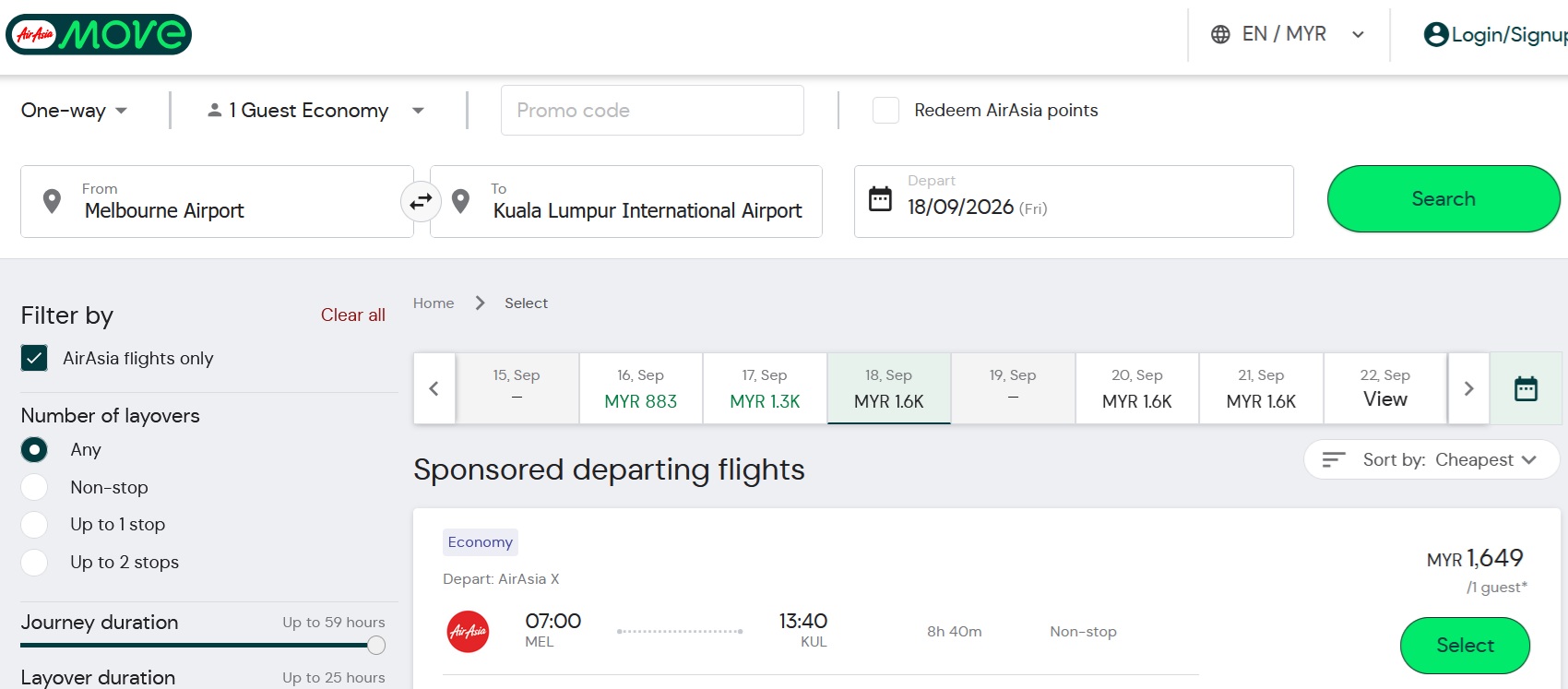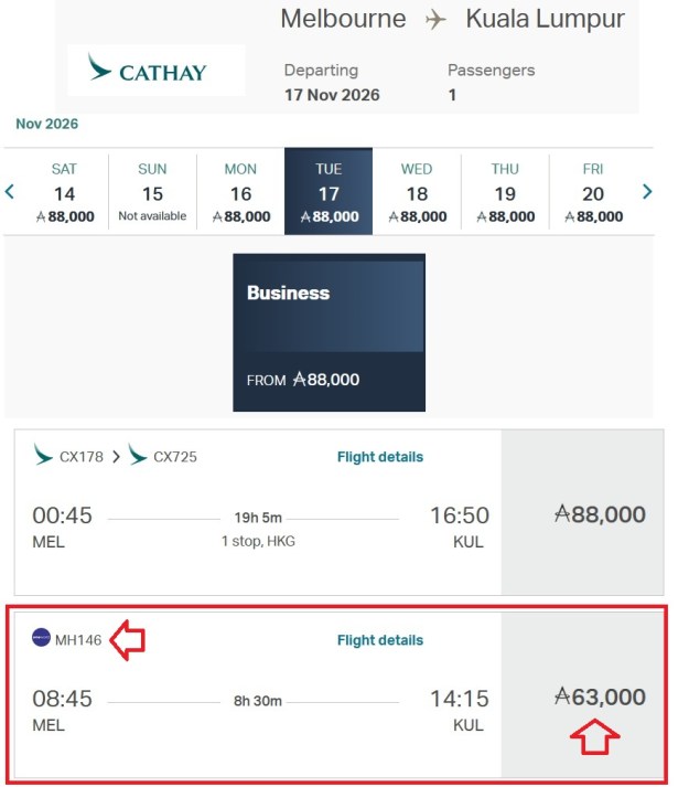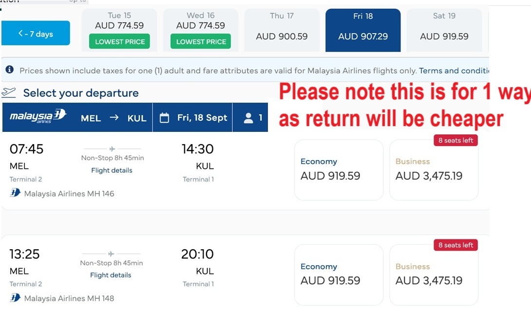 Below is an example for 18th September 2026 (more than 8 months from the date I drafted this article) where you will see that AirAsia (RM1.6K) and Malaysia Airlines (AUD901) tickets are high for one-way Mel to KL.