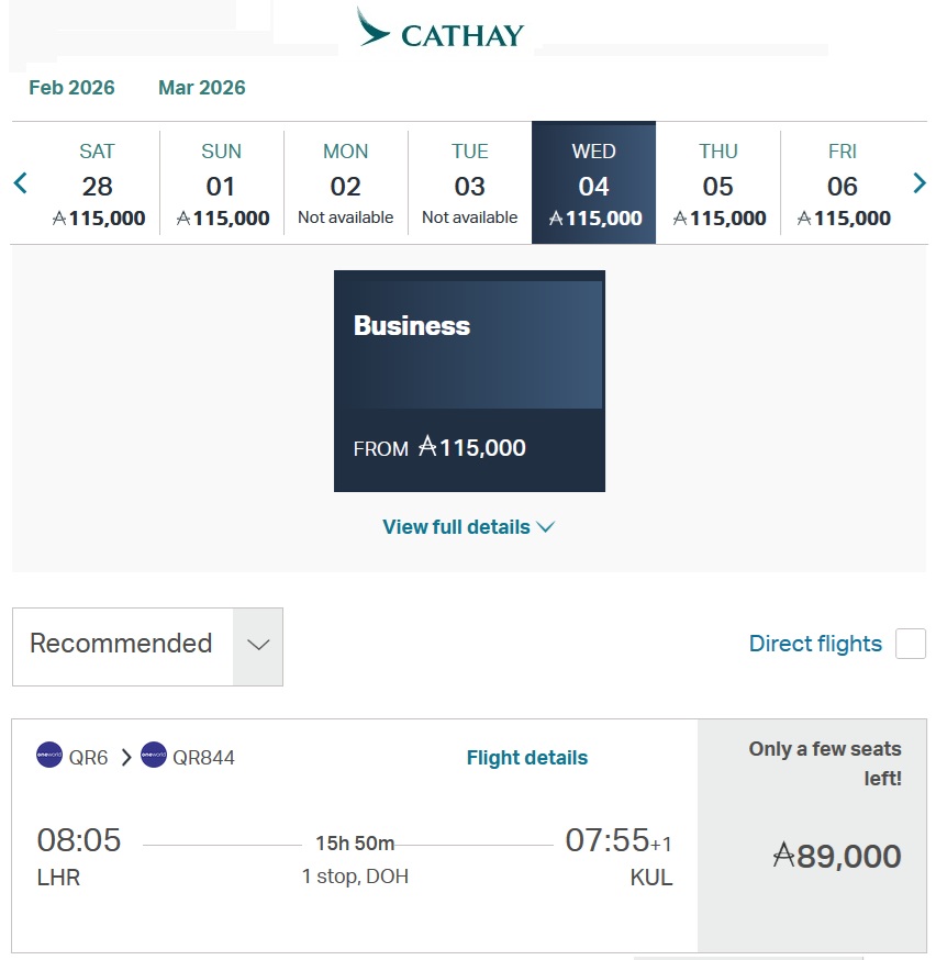 Now I am going to give you a pleasant surprise, with Asia Miles we can redeem a Biz Class from Europe to KL one-way (or vice-versa) with only 89K Asia Miles – less than the minimum 108K Enrich Points or 114K KrisFlyer Miles! Below image shows we can use Asia Miles to redeem a Qatar Airways one-way Business Class London LHR to Kuala Lumpur (KUL with just 89K Asia Miles.