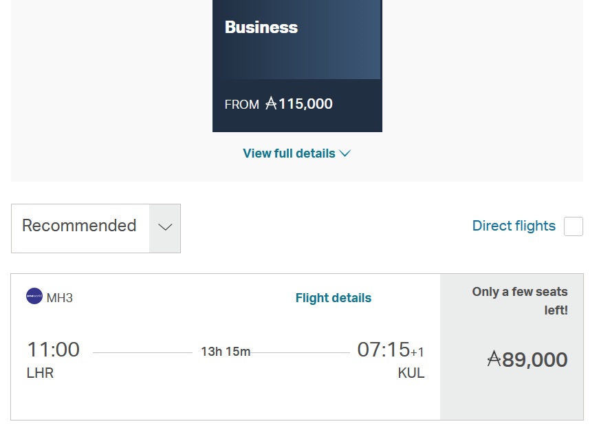 And we can redeem Malaysia Airlines flight with Asia Miles too! Below is an example where we also need 89K Asia Miles to redeem a one-way Biz Class LHR to KUL:
