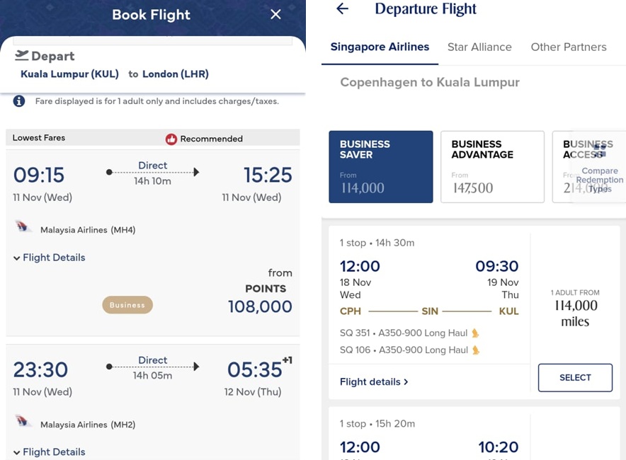 So for those of you who do spend more than RM200K per year and own Super Premium Credit Cards where you can convert to Enrich Points, KrisFlyer Miles and Asia Miles (or even Emirates or Turkish), this will give you many more options instead of having just one Frequent Flyer Program. For Example, you can redeem a Malaysia Airlines Business Class KUL to London on 11th November 2026 with 108K Enrich Points and return from Copenhagen with Singapore Airlines to KL on 18th November 2026 with 114K KrisFlyer Miles.