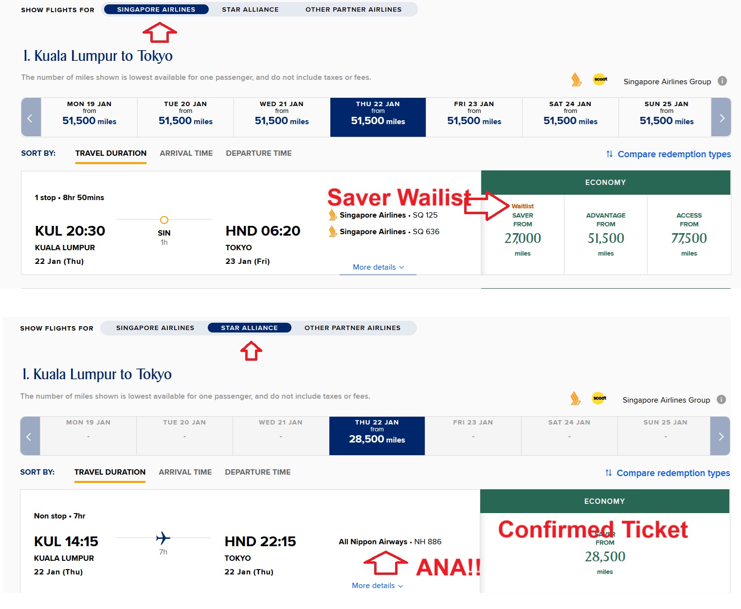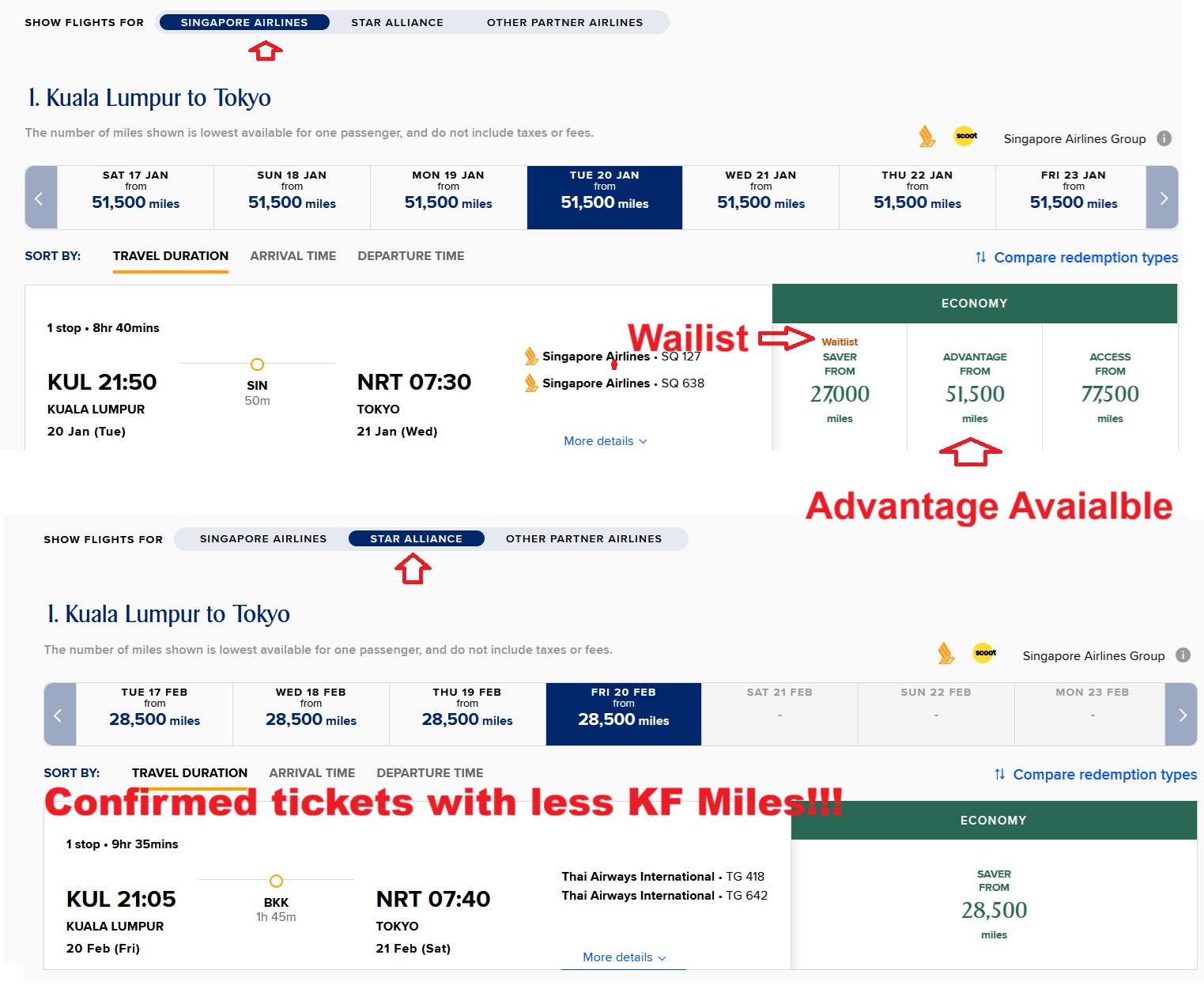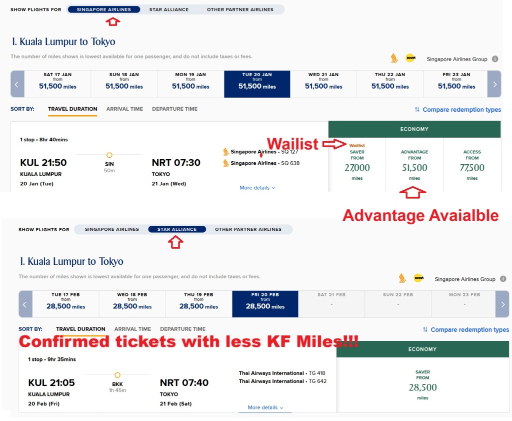 In addition to the above, here is why you should always also check Star Alliance at Singapore Airlines KrisFlyer website. Below images show that there are no confirmed Saver Option KUL to Tokyo but when you select Star Alliance you can get confirmed tickets!