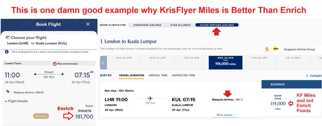 Below is an image showing that you can use 114K KrisFlyer Miles to redeem a one-way Malaysia Airlines Biz Class LHR (London Heathrow) to KUL – all you need to do is search Partner Airlines at KrisFlyer Website. At Malaysia Airlines App, I need 181.7K Enrich Points!!!