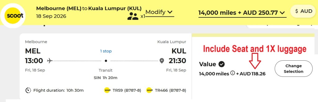 But Scoot we can get ticket on 18th September 2026 Melbourne to KUL using 14K KrisFlyer Miles and pay AUD118.26 (including choosing seat and Check-In Baggage).