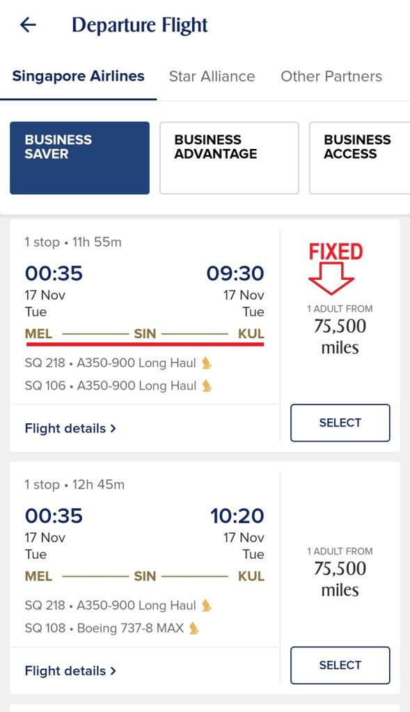 Below is an example where we only need need 63K Asia Miles to redeem a one-way Biz Class Melbourne to KL with Malaysia Airlines compared to (1) Malaysia Airlines 108K Enrich Points (please remember – if we redeem RETURN KUL/MEL than we may be able to redeem a 75K Biz Class ticket Melbourne to KL) and Singapore Airlines KrisFlyer 75,500 KrisFlyer Miles.