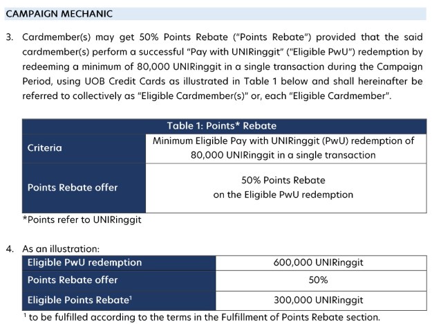 - For the 50% UNIRinggit Rebate, one needs to utilize minimum 80K UNIRinggit which is equivalent to minimum RM100 transaction with one’s credit card.