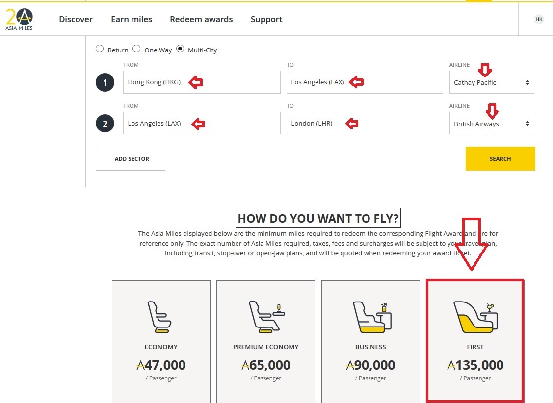 Asia Miles HK to LA to London Step 1