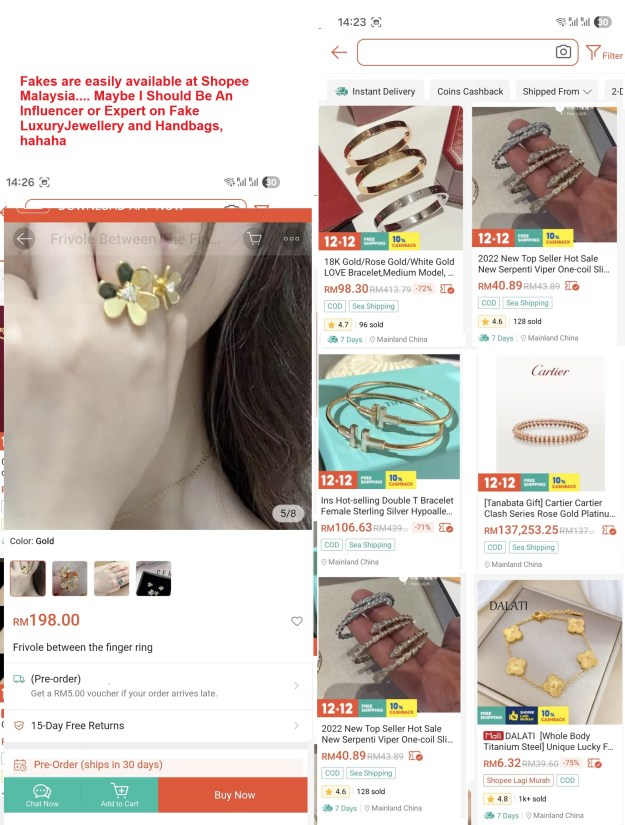 There are thousands of fake products at Shopee, not only for Channel, Hermes, VCA, Cartier or Bvlgari which will not harm us health wise but many other fake products that may be dangerous to us, examples Supplements and even Eye Mask!