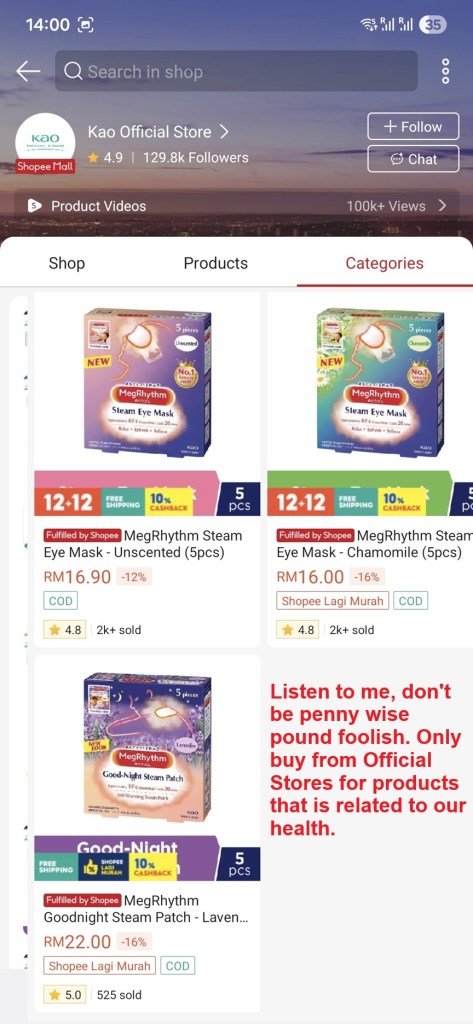Talking about Eye Mask, I did buy Kao Eye Masks to compare from (1) Kao Official Store where we can get 5 packs in a box and (2) also from a third party seller that sells 12 packs in a box at much cheaper price. I tell you, the eye masks are not the same! The original from Kao Official Store were soft and the heat was not extremely intense whereas the so called Eye Mask from the third party was thicker/harder and the heat was not even or too intense. Why is this important? You see, our eyes have many micro nerves and if the heat is too intense it may damage the nerves!