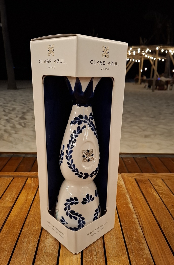 Below is the bottle of Clase Azul Resposado Tequila taken a Cancun beach.