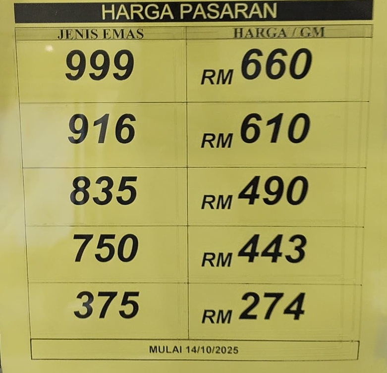 Below is an image that was sent to me about 2 weeks ago when the price of spot gold was near an All Time High (ATH). The price of 18K gold, i.e. 750, was RM443 per gram.