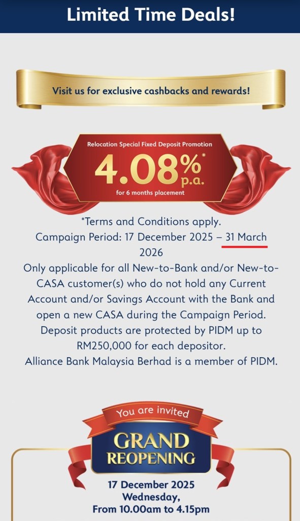 Fixed Deposit Promos Alliance Bank Alliance Bank is offering 3.98% for 12 months! And 4.08% at their Bukit Mentajam Branch. Click/tap on Page 3 button below to see next Fixed Deposit Promo. << Page 1 >> Page 3 Share this: Click to email a link to a friend (Opens in new window) Email Click to share on Facebook (Opens in new window) Facebook Click to share on Reddit (Opens in new window) Reddit Click to share on X (Opens in new window) X Click to share on Tumblr (Opens in new window) Tumblr Click to share on Pinterest (Opens in new window) Pinterest Like Loading... Pages: 1 2 3 4 5 6 7
