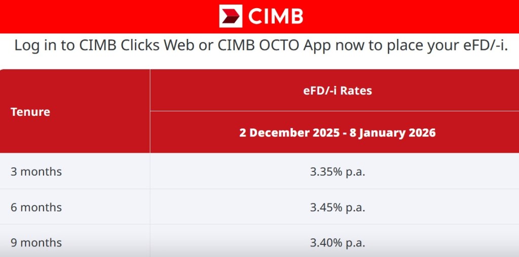 Fixed Deposit Promos CIMB The eFD Promo below is until 8th January 2026, so visit CIMB website for latest promos. Click/tap on Page 4 button below to see next Fixed Deposit Promo. << Page 2 >> Page 4 Share this: Click to email a link to a friend (Opens in new window) Email Click to share on Facebook (Opens in new window) Facebook Click to share on Reddit (Opens in new window) Reddit Click to share on X (Opens in new window) X Click to share on Tumblr (Opens in new window) Tumblr Click to share on Pinterest (Opens in new window) Pinterest Like Loading... Pages: 1 2 3 4 5 6 7