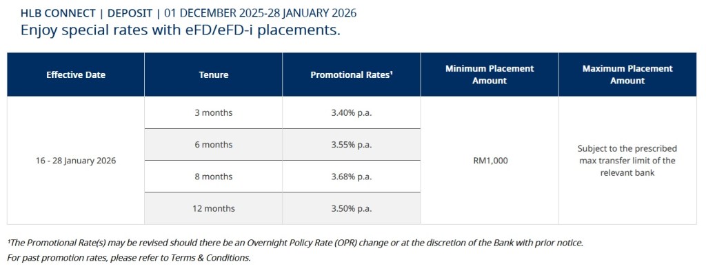 The eFD Promos below ends on 28th Jan 2026. Visit HLB website for Chinese New Year Fixed Deposit Promo after 8th January 2026.