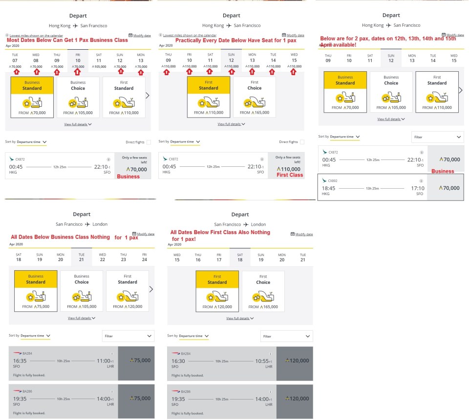 HK to SFO to LHR April First and Business Class