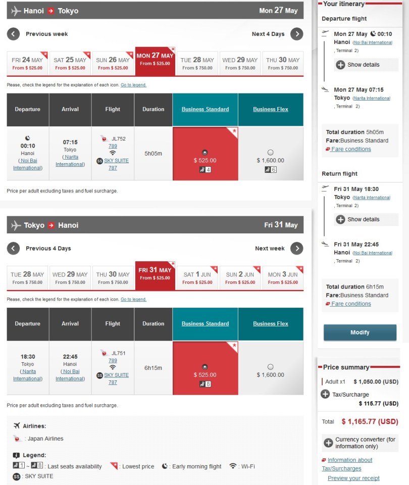 JL Hanoi Tokyo Return Price