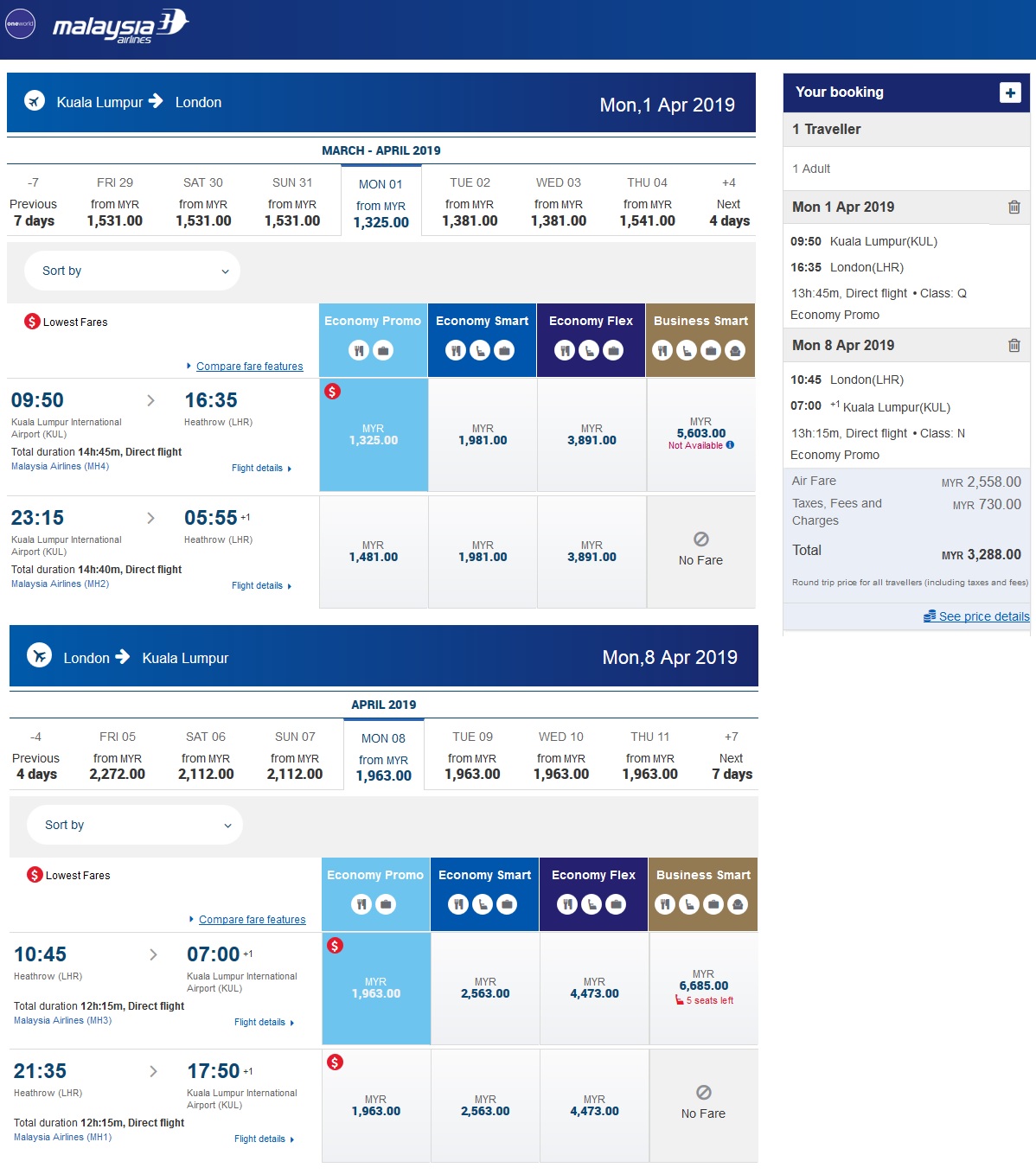 KL London Apr 2019 Price Economy
