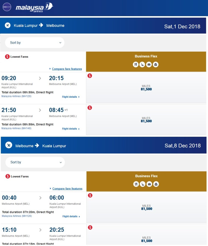 MAS Full Redemption Business Class KL MEL