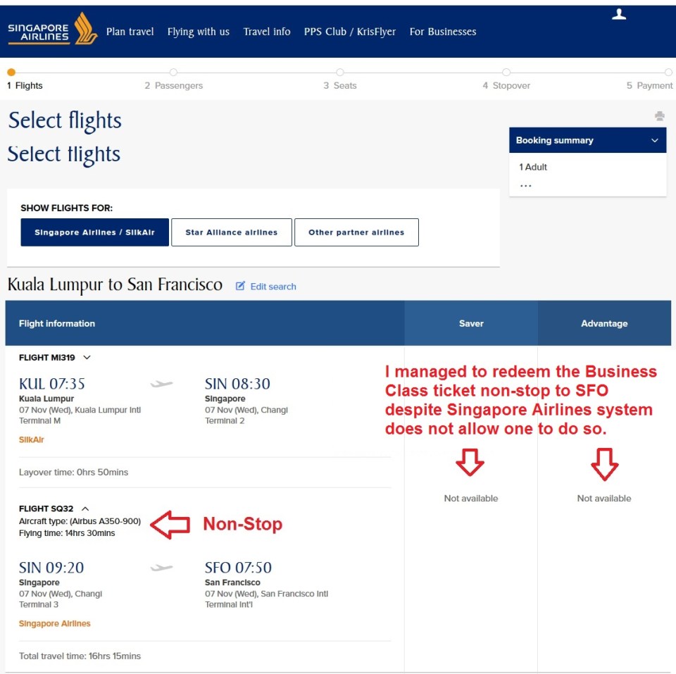 One KUL SFO Redeem Singapore Airlines Business
