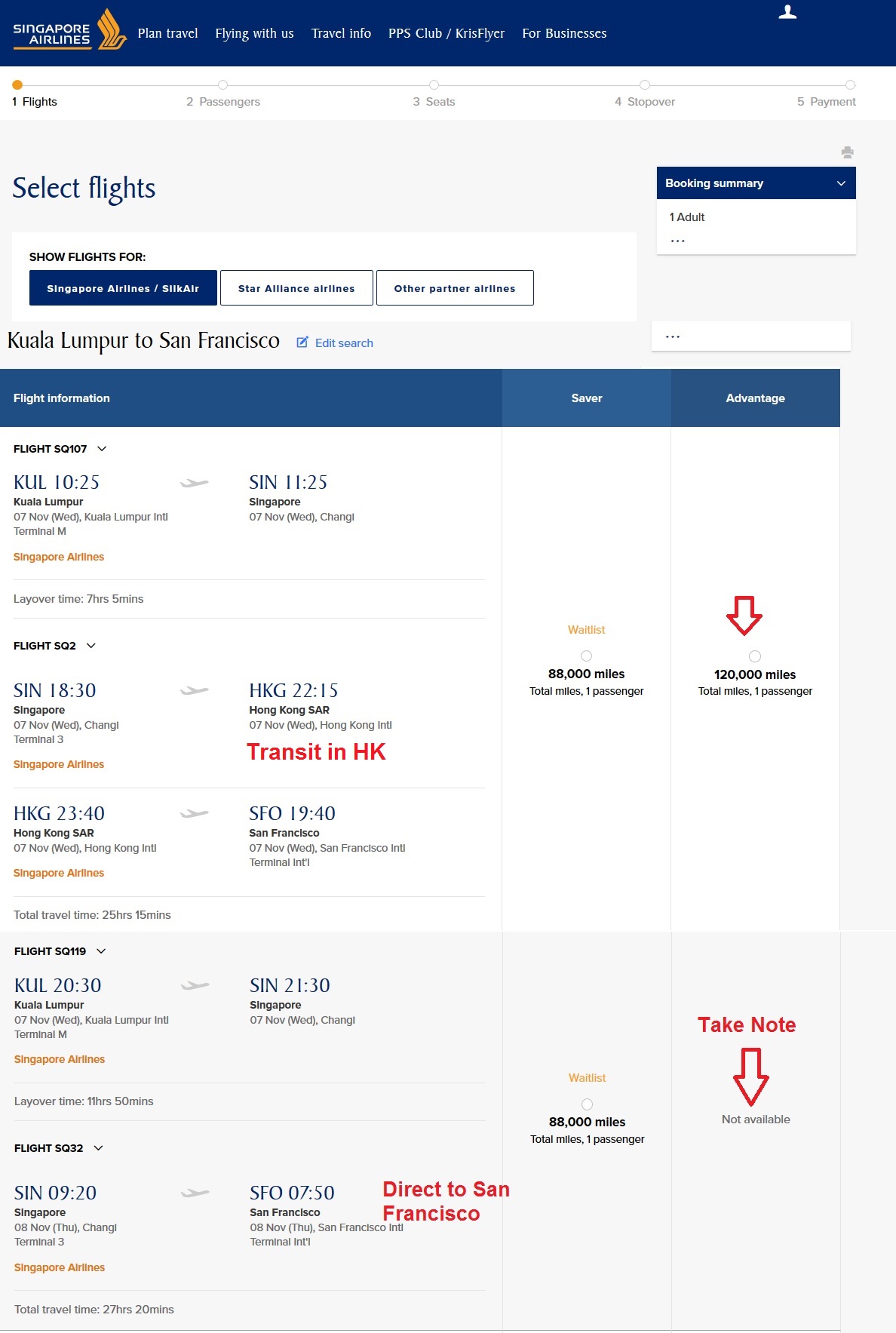 One Way KUL SFO Singapore Airlines Business Redeem 1