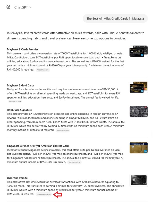 Anyway, I keyed in The Best Credit Cards in Malaysia and below was ChatGPT’s reply: