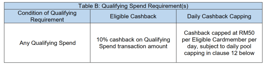 So from the above, basically there is a max daily cap of RM50 cash back per cardmember and the total pool allocated per day is RM6K.