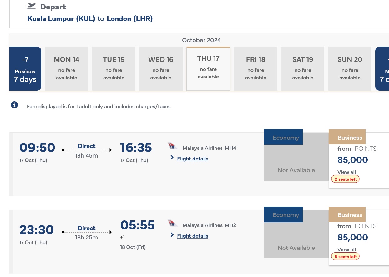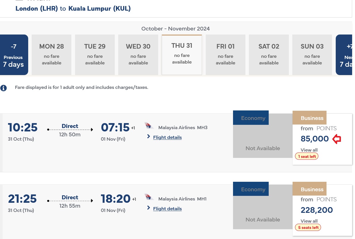 Enrich Points Required for Kuala Lumpur to/from London Business Class with Malaysia Airlines