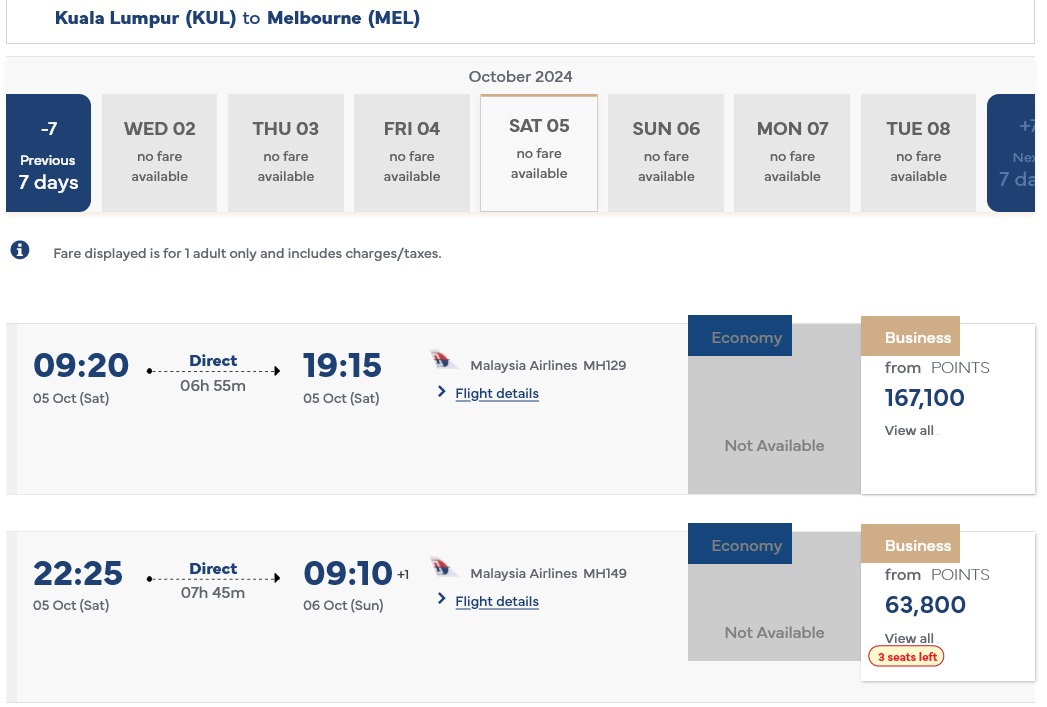 Once again, I am delighted to learn that we can get a Biz Class ticket Melbourne to KL for 63.5K Enrich Points 🙂