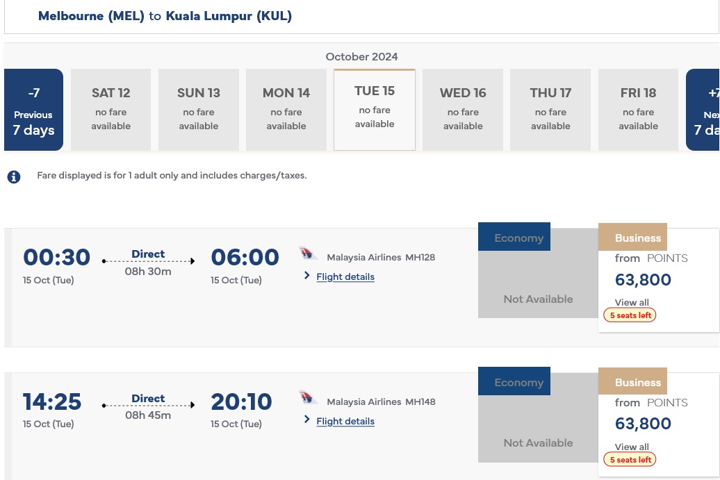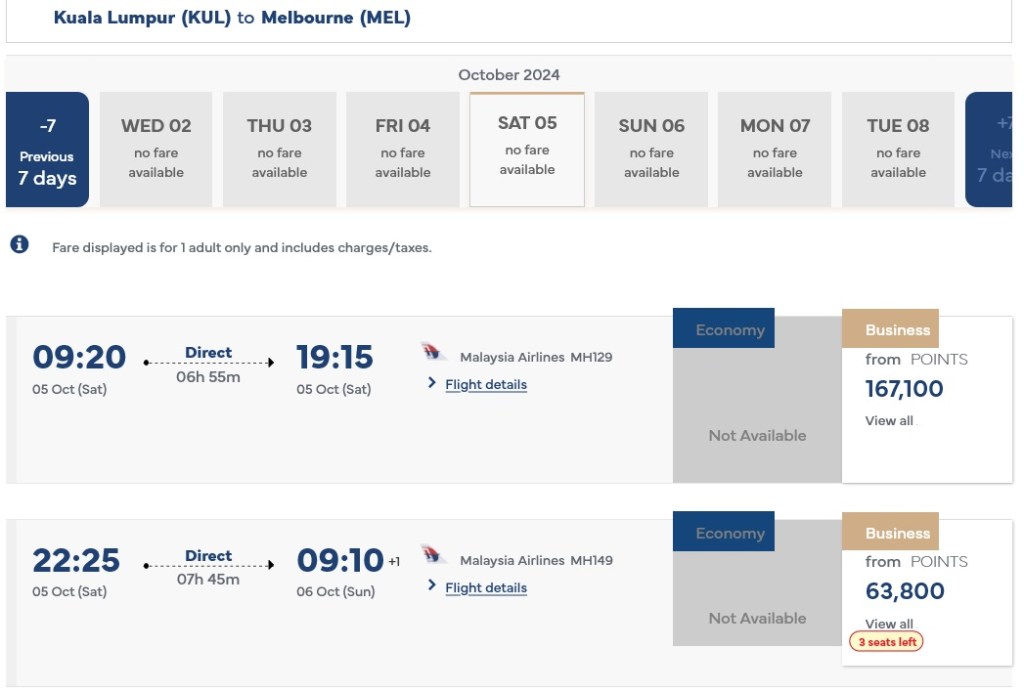Enrich Points Required for Kuala Lumpur to/from Melbourne Business Class with Malaysia Airlines
