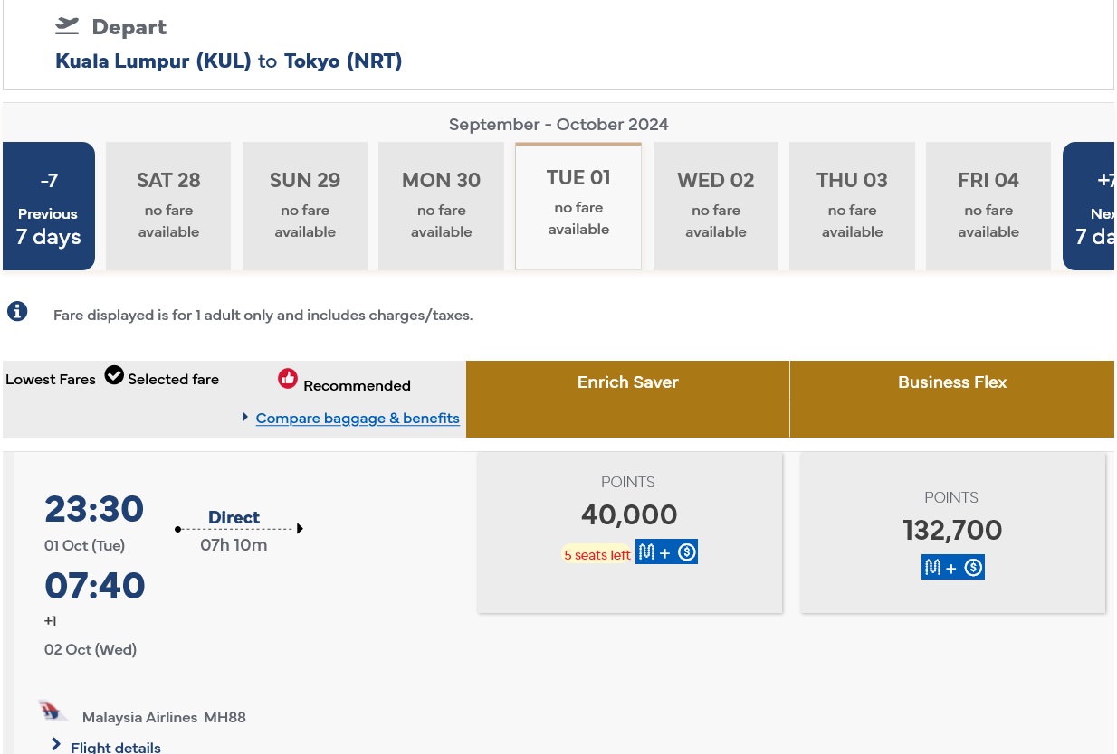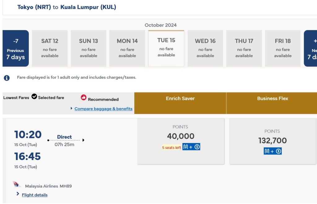 Enrich Points Required for Kuala Lumpur to/from Narita Business Class with Malaysia Airlines