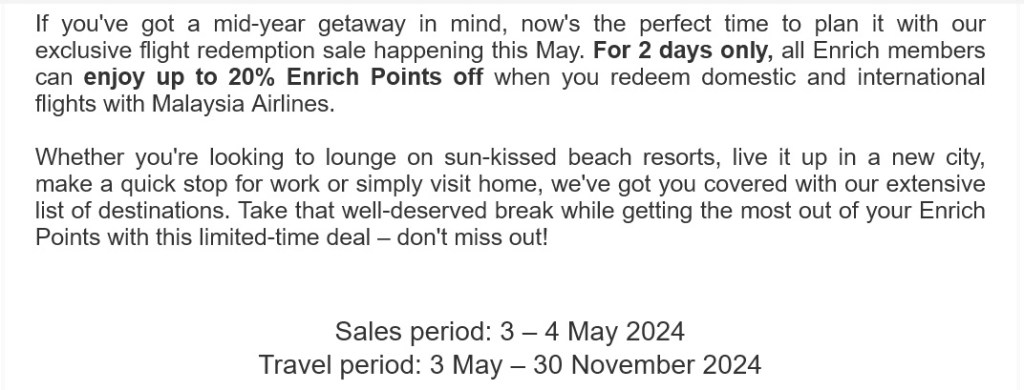 Today, 3rd May 2024, one of My Air Miles Disciple shared that Malaysia Airlines Enrich is having a Sale today and tomorrow…… and the Enrich Points required is actually less than what was mentioned in my above said article in April, i.e. we need even less Enrich Points today and tomorrow to redeem a Biz Class ticket.