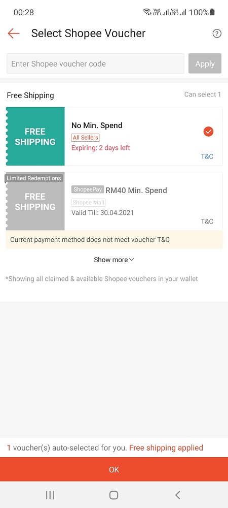 Step 2 – At Check Out, tap on Shopee Voucher to see if you have any applicable for the purchase.