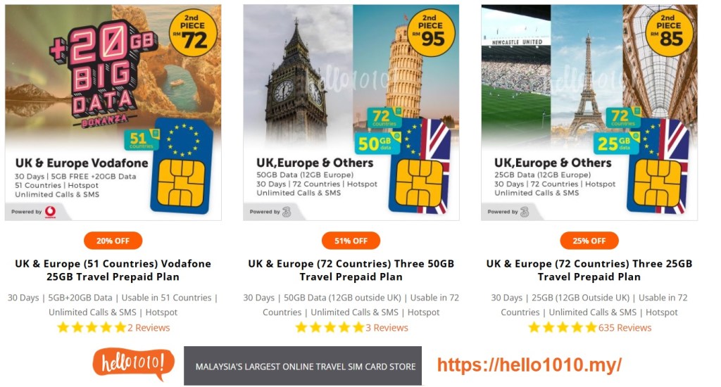 Below are a few options you can choose from when you are visiting Europe. There is even a UK Sim that allows you to use the SIM Card in 72 countries and up to 50GB Data!